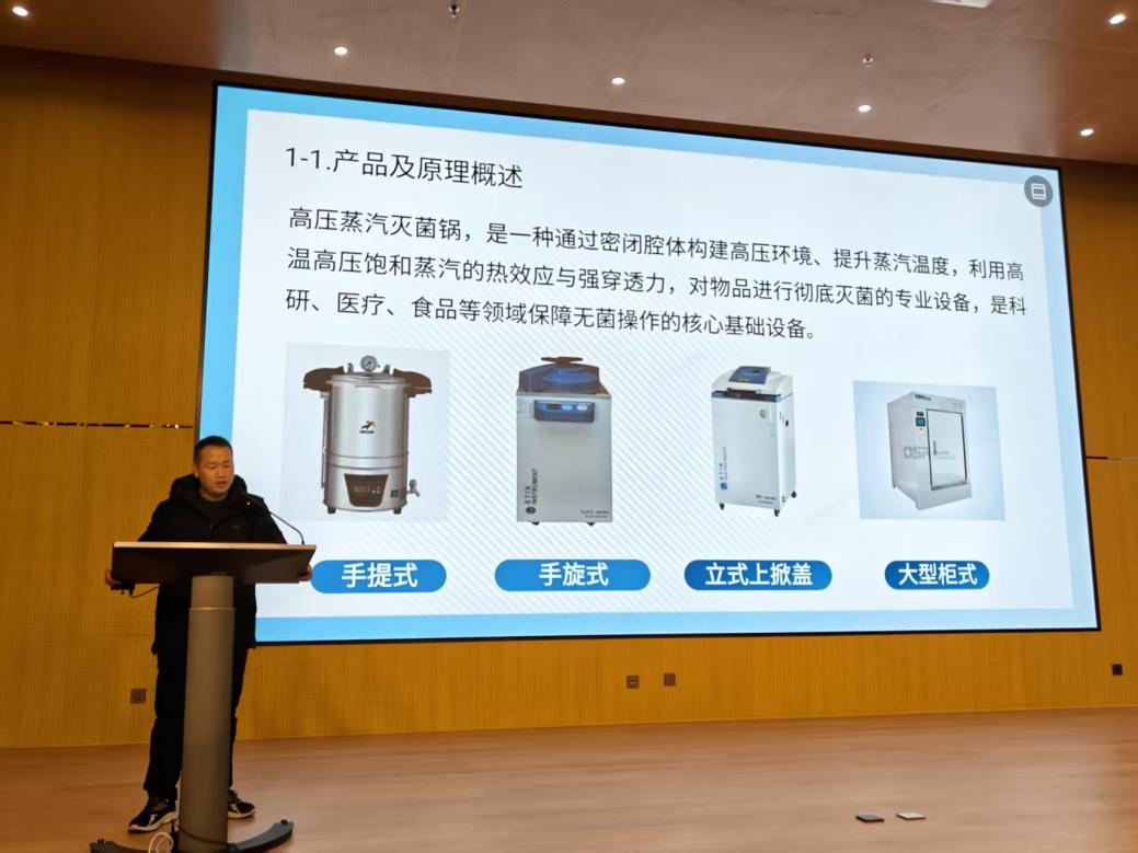 刘俊以“安全从你我做起,共守平安校园”为主题,围绕产品用途、灭菌步骤、使用登记证办理及高压灭菌锅使用注意事项四方面,深入剖析了高压蒸汽灭菌锅使用时的关键注意事项与潜在风险点,特别是对压力容器安全、防止烫伤以及日常维护保养等环节进行了着重强调。